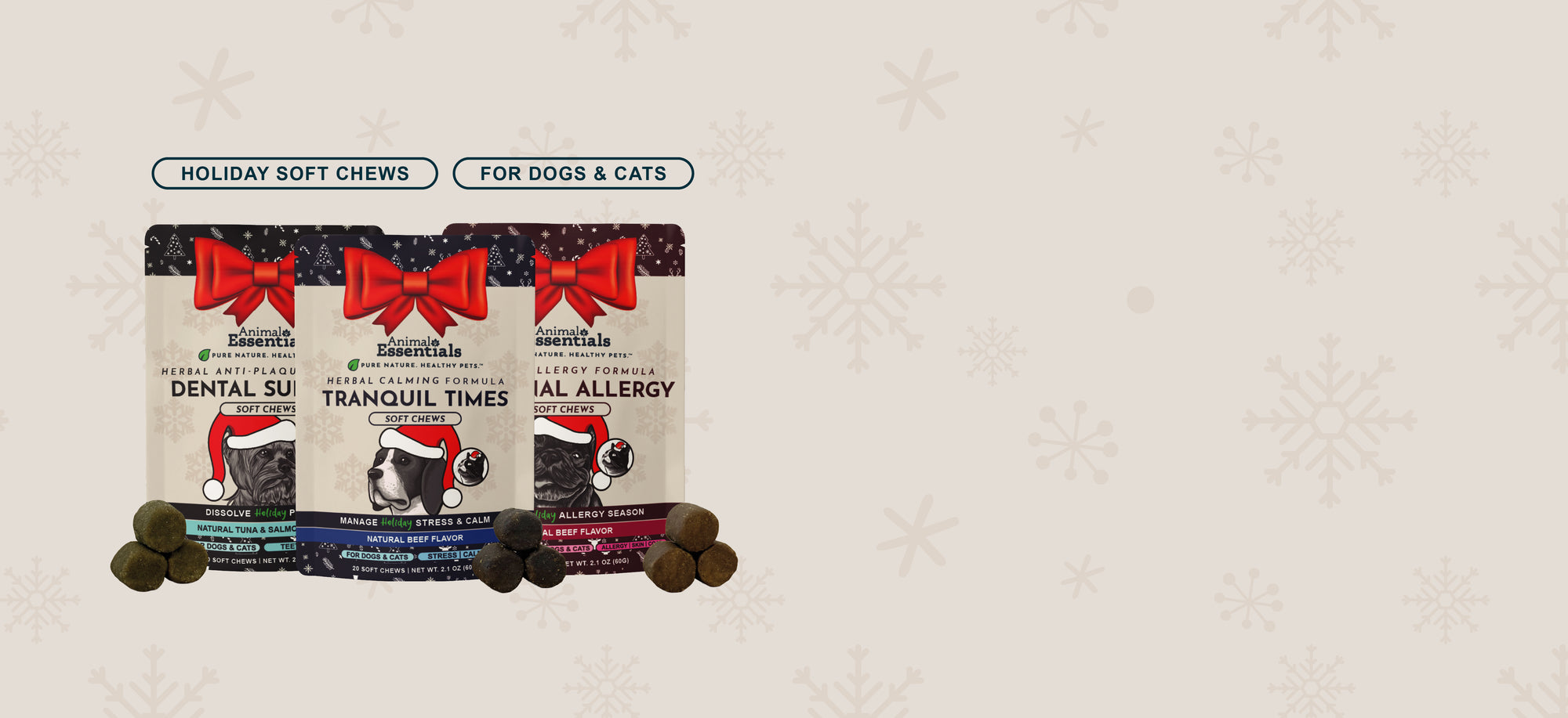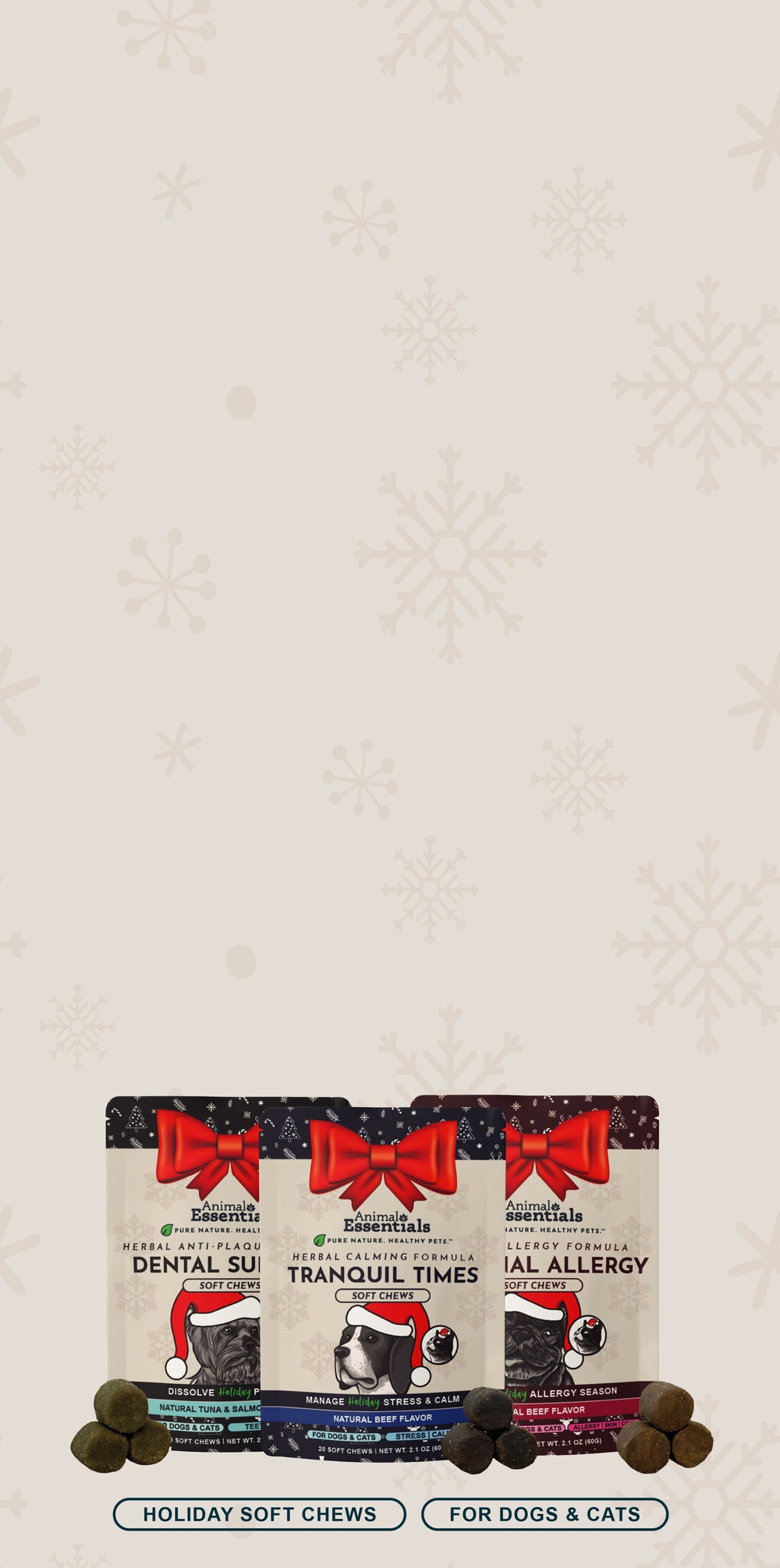 Our time-tested Calm, Dental, and Allergy formulas — now in limited-release soft chew form for festive, functional support. Perfect for stocking stuffers or last-minute gift ideas.
