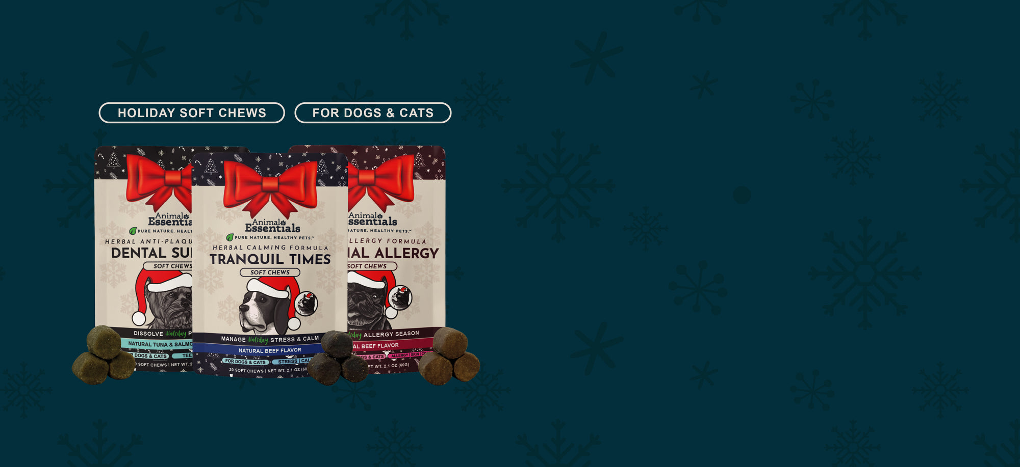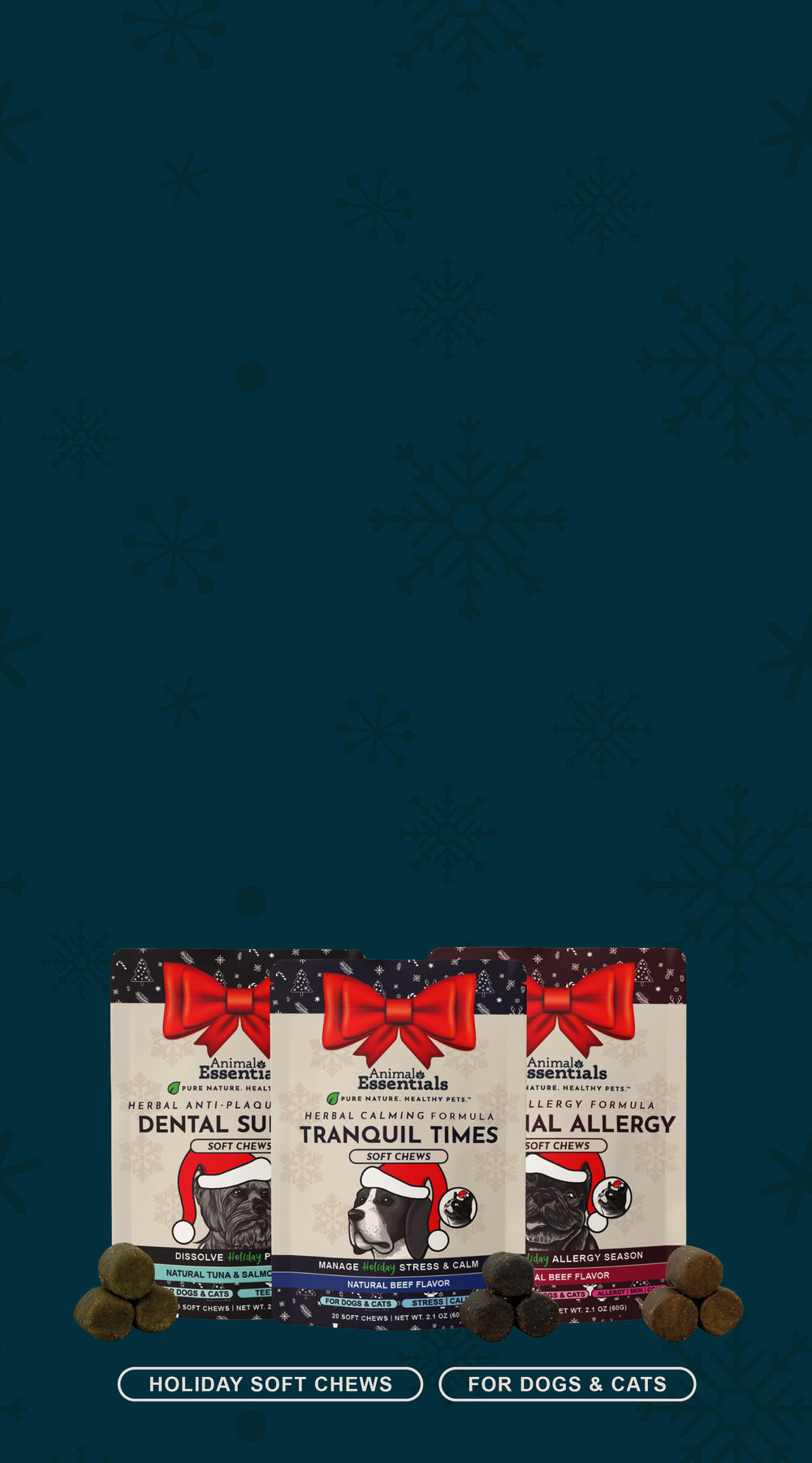 Our time-honored Calm, Dental, and Allergy formulas — now in festive soft-chew form pets love. Perfect for stocking stuffers or last-minute gifts.