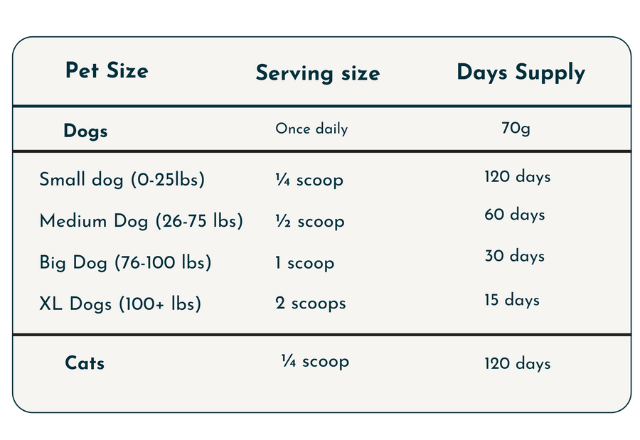 Sprinkle the powder directly into your pet’s food. It has a mild, earthy flavor and blends easily with both wet and dry food formats.